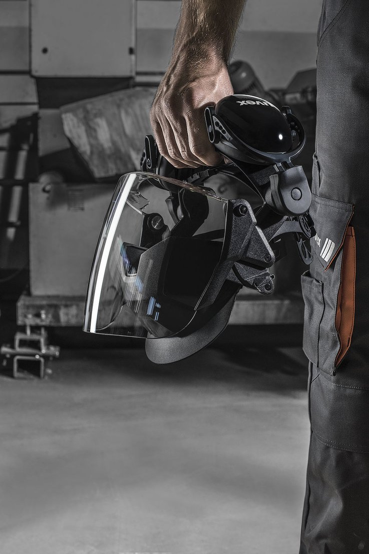 Osłona dała podstawę do ogólnego projektu i opracowania funkcjonalnego i nowoczesnego systemu ochrony twarzy. Do pałąka można dodawać rożne elementy, dzięki czemu zyskujemy imponujący, wieloczęściowy system. Szybka wygodnie okala twarzy użytkownika i można ją łatwo podninść, gdy nie jest używana. Smukła konstrukcja całego zestawu zapewnia komfort i maksymalną swobodę ruchów.