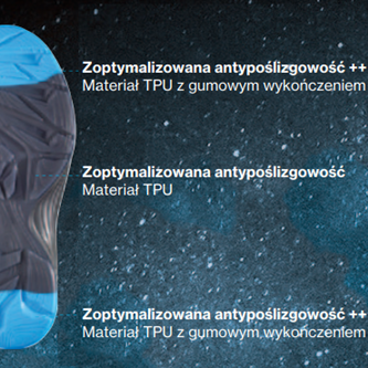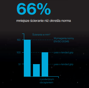Technologia uvex x-tended grip oparta na podeszwie zewnętrznej z TPU najnowszej generacji gwarantuje jeszcze lepszą wydajność dzięki odporności na ścieranie i poślizg na gładkich lub mokrych podłogach. Rezultat: większa stabilność i bezpieczeństwo użytkownika podczas chodzenia. Mniejsze zużycie, a tym samym niższe koszty dzięki dłuższej żywotności.
