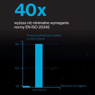 40x lepsza przepuszczalność pary wodnej niż minimalne wymagania normy EN ISO 20345