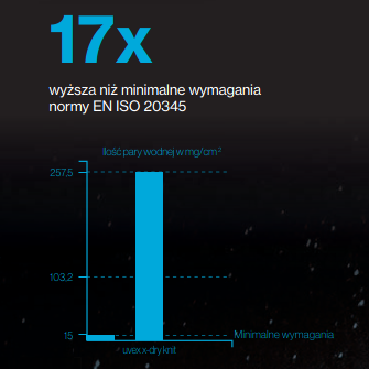 17x wyższy współczynnik pary wodnej niż minimalne wymagania normy EN ISO 20345