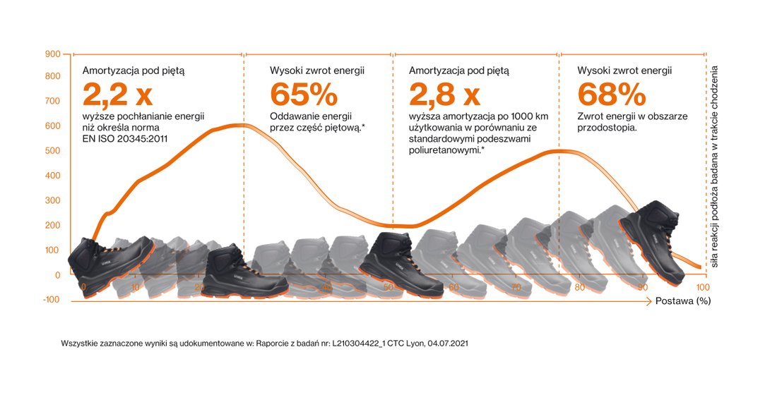 Nowa, innowacyjna technologia podeszwy poliuretanowej uvex — uvex i-PUREnrj — zwraca energię z całej powierzchni podeszwy z powrotem do użytkownika, na nowo definiując amortyzację i stabilność. Podeszwa uvex 3 zapobiega zmęczeniu stóp dzięki 68% zwrotowi energii w przedniej części stopy, 65% zwrotowi energii pod piętą i wysokiemu poziomowi amortyzacji (44 dżuli).