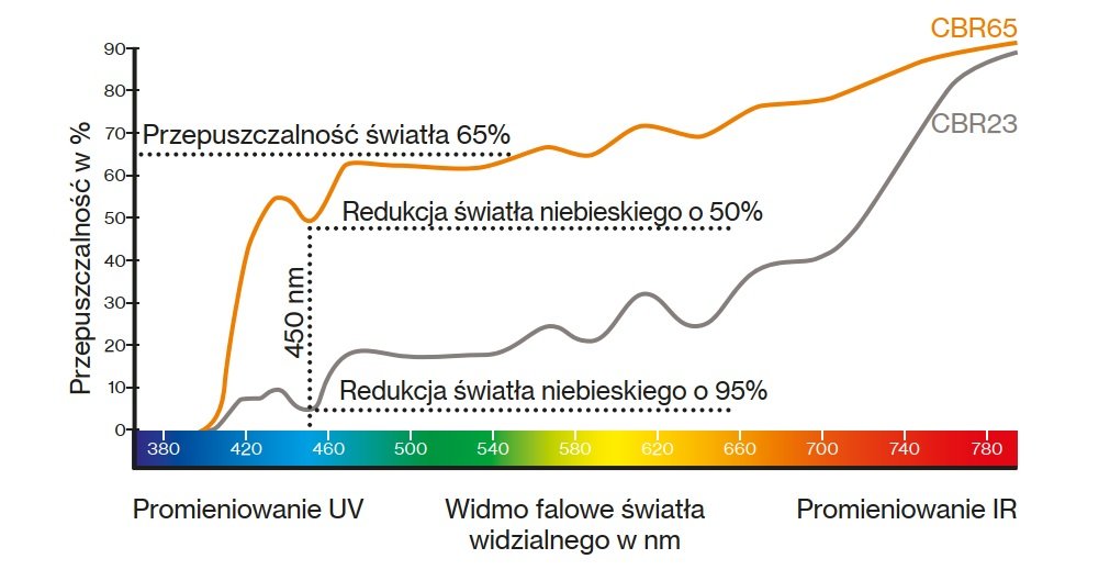 Technologia soczewek uvex CBR65 i CBR23 znacznie różni się od technologii soczewek uvex UV400. Soczewki CBR filtrują wysokoenergetyczne światło widzialne (HEV), które powoduje szczególne obciążenie siatkówki w zakresie od 380 nm do 450 nm, nawet o 50–95%.
